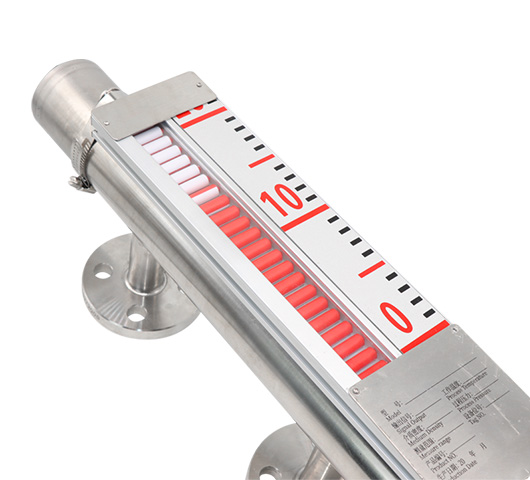 磁翻板液位計(也可稱為磁性浮子液位計)根據(jù)浮力原理和磁性耦合作用研制而成。當被測容器中的液位升降時,液位計本體管中的磁性浮子也隨之升降,浮子內(nèi)的永久磁鋼通過磁耦合傳遞到磁翻柱指示器,驅(qū)動紅、白翻柱翻轉(zhuǎn)180°,當液位上升時翻柱由白色轉(zhuǎn)變?yōu)榧t色,當液位下降時翻柱由紅色轉(zhuǎn)變?yōu)榘咨甘酒鞯募t白交界處為容器內(nèi)部液位的實際高度,從而實現(xiàn)液位清晰的指示。