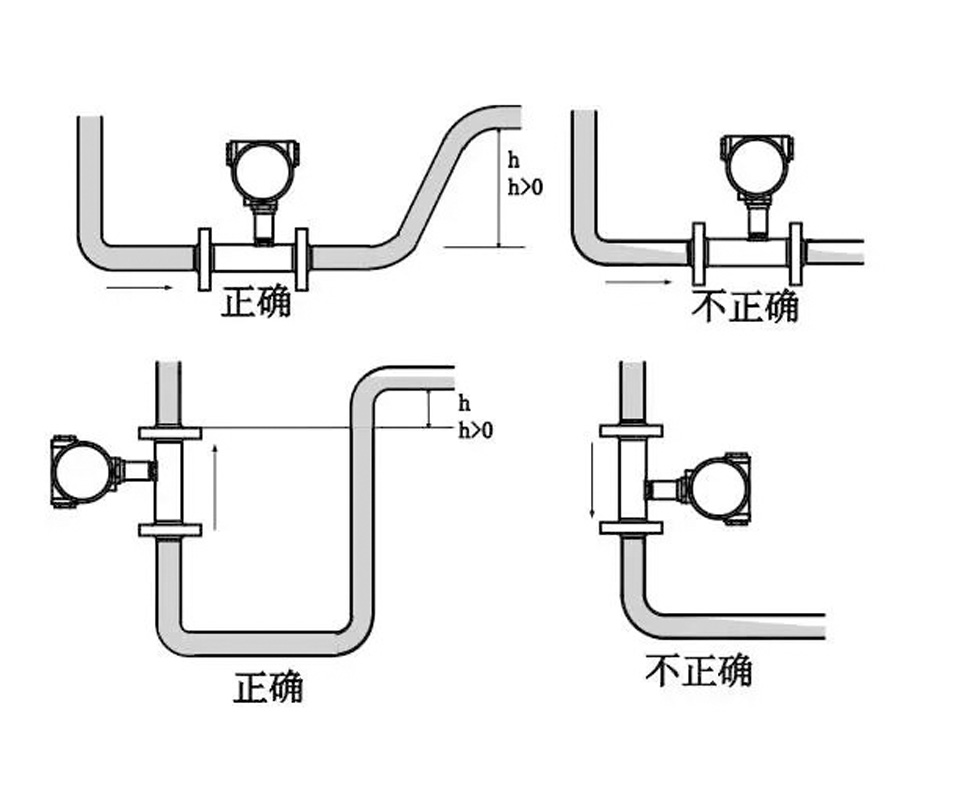 流量計(jì)安裝在彎頭、死角處或者直管前后均應(yīng)保證一定的直管段,其中進(jìn)口端的直管長(zhǎng)度不得少于10倍管道直徑,出口端的直管長(zhǎng)度不得少于5倍管道直徑。